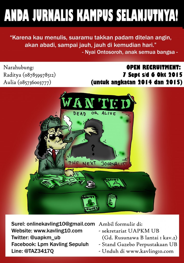 Unit Aktivitas Pers Kampus Universitas Brawijaya (UAPKM UB) atau yang lebih dikenal dengan nama LPM Kavling10 telah membuka pendaftaran Anggota Baru tahun agkatan 2015.