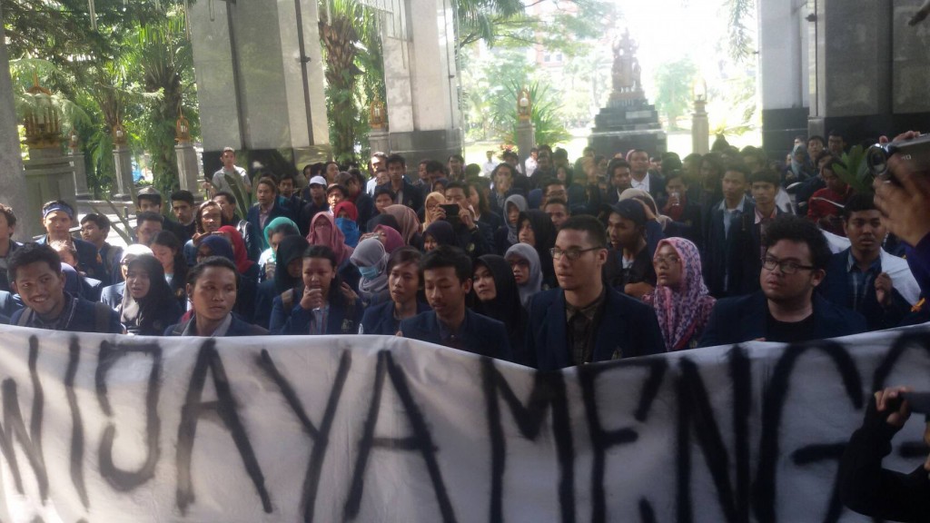 Aksi mahasiswa menuntut kejelasan status Vokasi sebagai fakultas di depan gedung Rektorat UB (17/5). (dok. Asry/Kav.10)
