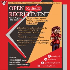 Unit Aktivitas Pers Kampus Universitas Brawijaya (UAPKM UB) atau yang lebih dikenal dengan nama LPM Kavling 10 telah membuka pendaftaran...