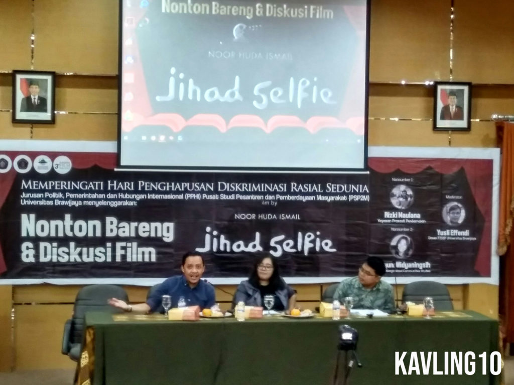 MALANG-KAV.10 Jurusan Politik Pemerintahan dan Hubungan Internasional Fakultas Ilmu Sosial dan Ilmu Politik (PPHI FISIP) bekerja sama dengan Pusat Studi Pesantren dan Pemberdayaan Masyarakat (PSP2M) UB mengadakan acara nonton bareng dan diskusi film ‘Jihad Selfie’ di Auditorium Nuswantara FISIP UB, Rabu (21/03). Film karya Noor Huda Ismail ini mengisahkan tentang perjalanan pelajar Indonesia di Turki yang tertarik bergabung dengan kelompok ekstremis ISIS melalui media sosial.