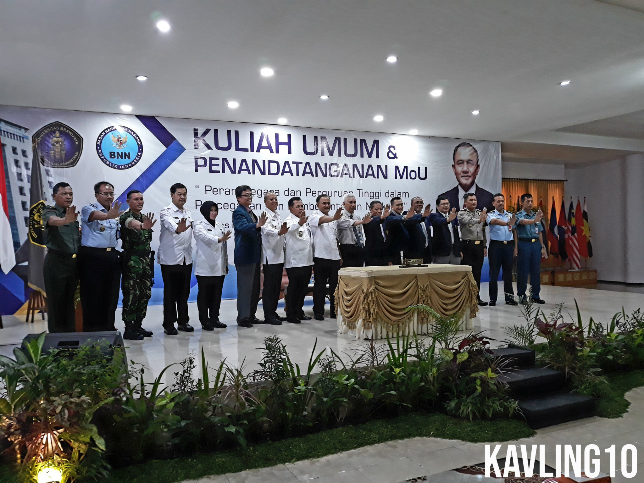 MALANG-KAV.10 Identitas Universitas Brawijaya (UB) sebagai kampus dengan jumlah mahasiswa terbanyak, menjadi peluang bagi para pengedar obat-obatan terlarang. Maka dari itu UB bersama Badan Narkotika Nasional (BNN) mengadakan kuliah umum dan penandatanganan nota kesepahaman dengan tema “Pentingnya Peran Negara dan Perguruan Tinggi dalam Pencegahan dan Pemberantasan Narkoba” yang berlangsung di Aula lantai empat Gedung A Fakultas Ilmu Administrasi pada Selasa kemarin (10/4).