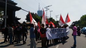 Massa aksi sedang berorasi di depan Kantor Polda Jawa Timur, memprotes upaya kriminalisasi terhadap warga Sepat (27/07). Foto: Nuris