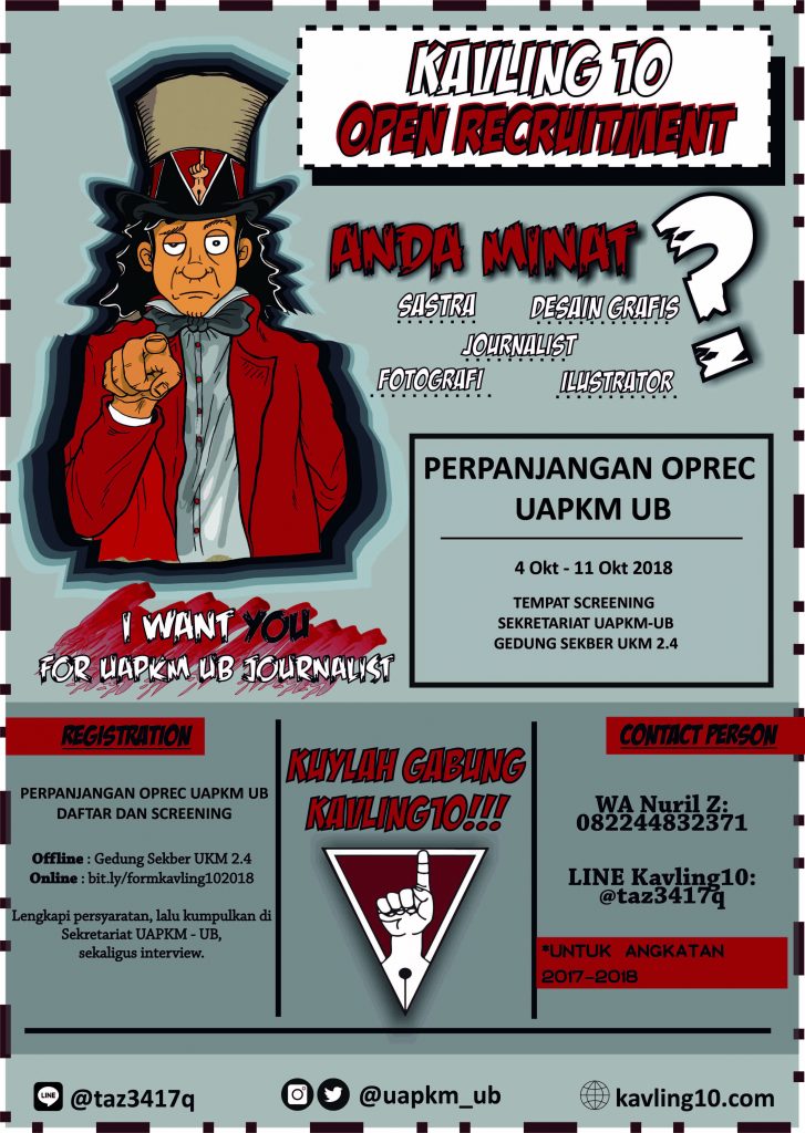Kabar bahagia bagi mahasiswa UB angkatan 2017 & 2018 yang tertarik dan ingin belajar mengenai jurnalistik, sastra dan fotografi, Unit Aktivitas Pers Kampus Mahasiswa (UAPKM) Kavling10 memperpanjang pendaftaran anggota baru periode 2018 mulai dari 4 Oktober 2018 hingga 11 Oktober 2018. Mari bergabung bersama kami.