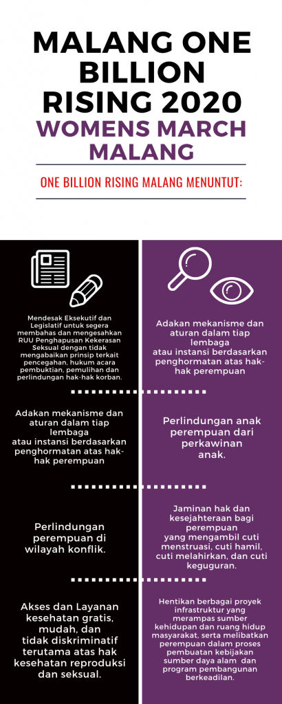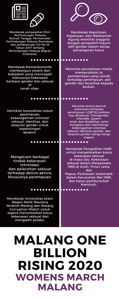 MALANG-KAV.10 EM UB bersama Women’s March Malang mengadakan aksi One Billion Rising. Jumat (14/2) kemarin, bertepatan dengan Hari Valentine. Pada aksi kali ini, ada 17 poin tuntutan yang dibawa, sebagian besar menyasar soal isu keperempuanan.