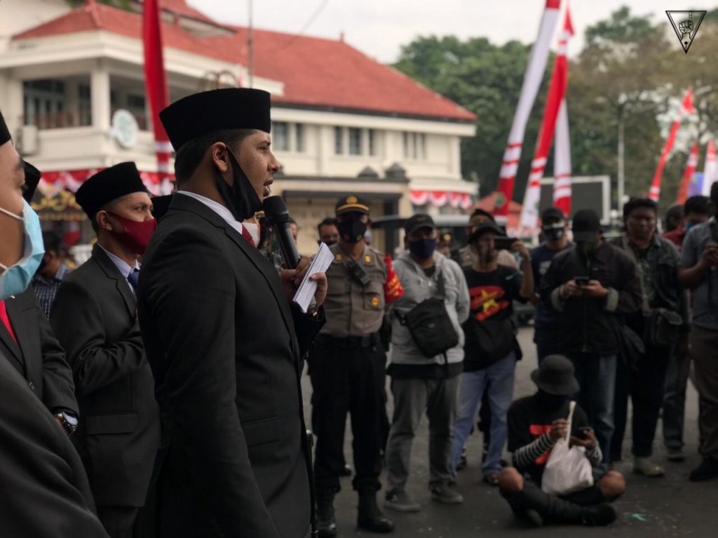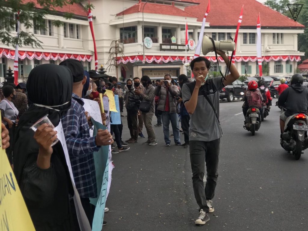 MALANG-KAV.10 Aksi Tolak Omnibus Law Kamis (14/8) lalu dihadiri berbagai mahasiswa yang tergabung dalam aliansi Malang Menolak Omnibus Law. Setelah maraknya postingan banyak influencer soal #IndonesiaButuhKerja yang dinilai mendukung Omnibus Law Cipta Kerja hingga menimbulkan keributan di masyarakat, menjadi momen aliansi ini dalam menuntut penolakan. Aksi sempat dihadiri oleh beberapa perwakilan DPRD Kota Malang yang menjawab tuntutan massa. Jawaban mereka sempat dikomentari sebagai “Tukang Pos” karena dinilai sebatas jawaban diplomatis saja.
