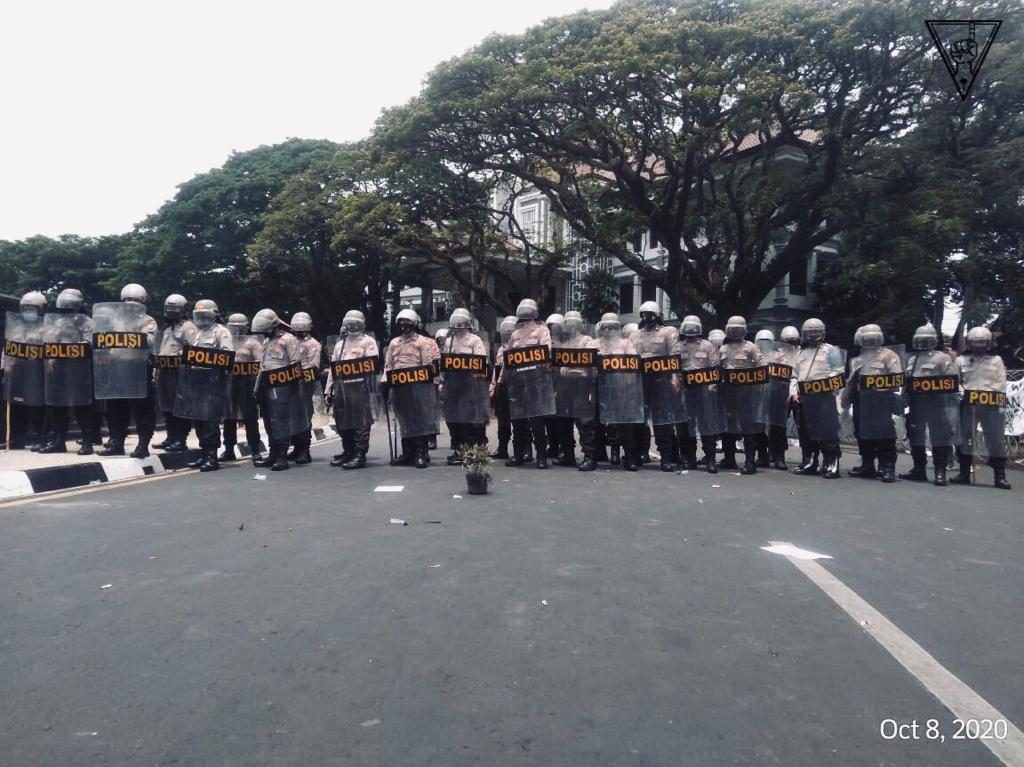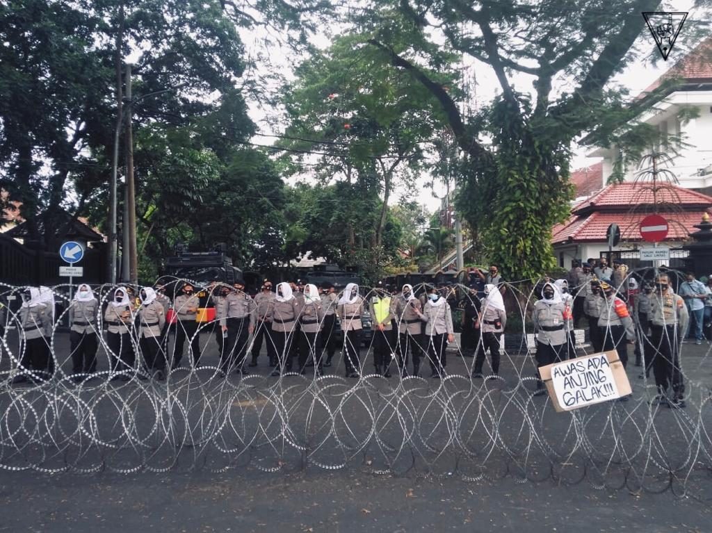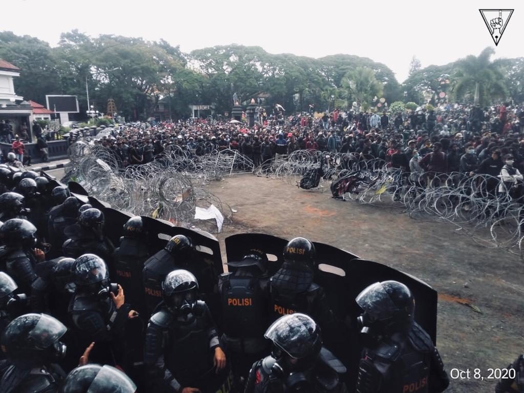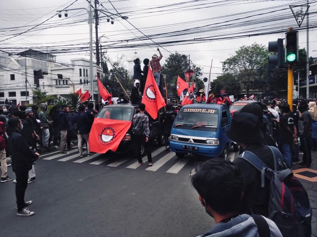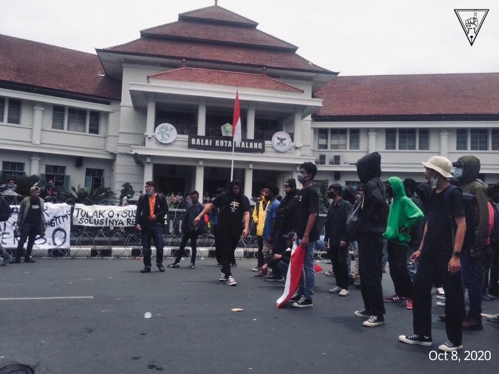 MALANG-KAV.10 Ribuan massa aksi yang menolak pengesahan UU Omnibus Law Cipta Kerja melakukan demonstrasi di depan Balai Kota Malang, Kamis (10/8). Massa aksi dari berbagai elemen mulai mengorganisasi kerumuman sejak pukul 08.00 WIB. Sebelum melakukan longmars ke Balai Kota, massa berkumpul dan melakukan orasi terlebih dahulu di perempatan BCA, tepatnya di Jalan Kahuripan. Mobil komando massa aksi dipimpin oleh Solidaritas Perjuangan Buruh Indonesia (SPBI). Pada pukul 10.18 WIB massa mulai merangsek maju ke Balai Kota.