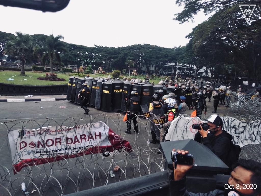 Demonstrasi pada hari itu tidak berjalan kondusif. Dari pantauan Kavling10, setidaknya ada dua kali kekacauan (chaos) yang menyebabkan massa harus mundur. Kekacauan pertama terjadi pada sekitar pukul 11.25 WIB. Massa yang melempari Gedung DPRD Kota Malang dengan botol air mineral hingga petasan dibalas dengan gas air mata dan water cannon dari pihak kepolisian yang berjaga.