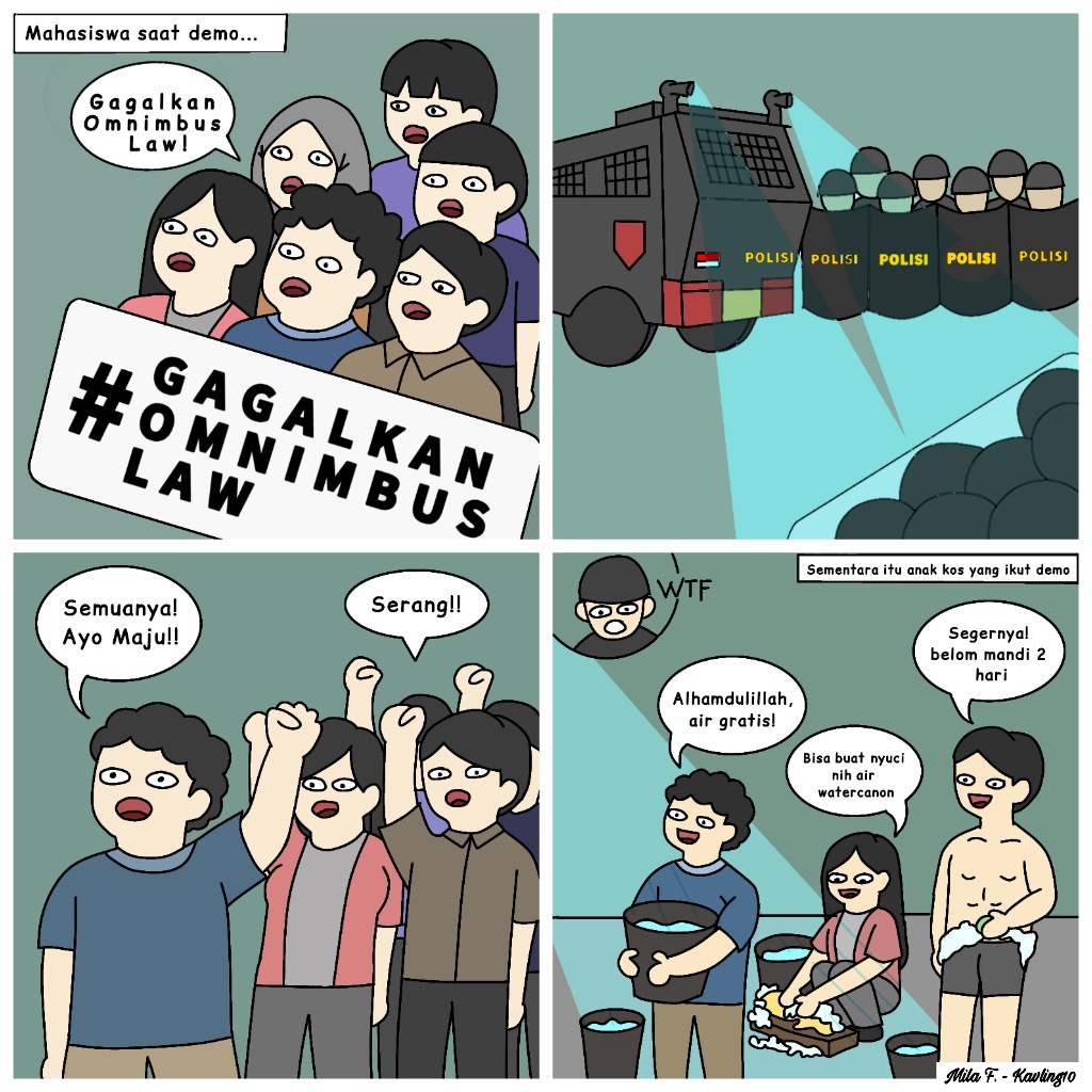 Akhir-akhir ini telah terjadi aksi demonstrasi terhadap kebijakan Omnimbus Law dan UU Cipta Kerja yang memanas di kalangan masyarakat. Banyak pihak yang ikut demo tersebut, mulai dari mahasiswa, buruh, bahkan anak STM. Namun siapa sangka segerombolan anak kos melakukan aksi yang tak terduga dalam mengikuti demonstrasi kali ini, mereka membuat para polisi tidak berkutik dalam menghadapi aksi tersebut.