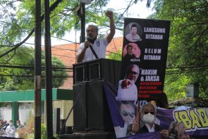 Ketua Rumah Perlindungan Perempuan dan Anak Indonesia (RPPAI), Fuad Dwiyono saat berorasi dalam aksi massa di sidang lanjutan kasus pelecehan...