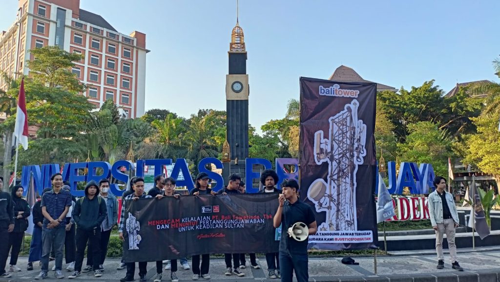MALANG-KAV.10 Kamis (10/08) Aliansi Mahasiswa Resah (Amarah) Brawijaya lakukan aksi damai di bundaran Universitas Brawijaya (UB). Aksi yang dihadiri beberapa aliansi mahasiswa lain, seperti Aliansi Jingga dan Aliansi Satu Jiwa, ditujukan sebagai bentuk solidaritas atas kejadian yang menimpa Sultan Ri’fat Alfatih, mahasiswa ilmu pemerintahan UB. Dalam aksi ini dilakukan orasi-orasi yang berisi tuntutan kepada PT. Bali Tower agar bertanggung jawab penuh atas kelalaiannya yang menyebabkan Sultan harus dirawat di rumah sakit. Selain orasi, pada aksi ini juga dilakukan teatrikal bertajuk ruqiyah PT. Bali Tower dengan menyiramkan air kembang ke spanduk yang bertuliskan “SEGERA TANGGUNG JAWAB TERHADAP SAUDARA KAMI #JUSTICEFORSULTAN” dengan latar belakang gambar Bali Tower.
