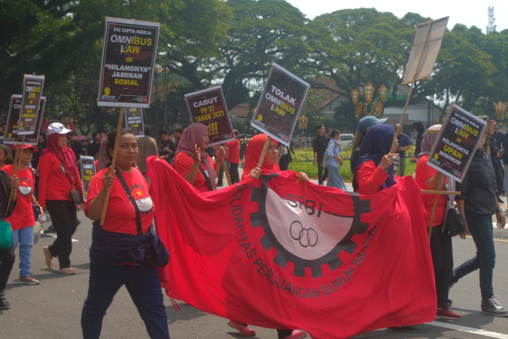 Berbagai kain penuh dengan tulisan tuntutan dan amarah dari para buruh mendampingi derap langkah kaki buruh dan mahasiswa yang tergabung pada hari itu. 2 mobil komando dengan 1 mobil digunakan untuk orasi para perwakilan buruh dan mahasiswa. Mobil diparkir di antara gedung walikota dan DPRD membelakangi aparat kepolisian yang berdiri dan saling berbincang. Sementara itu, buruh dan mahasiswa melakukan orasi.
