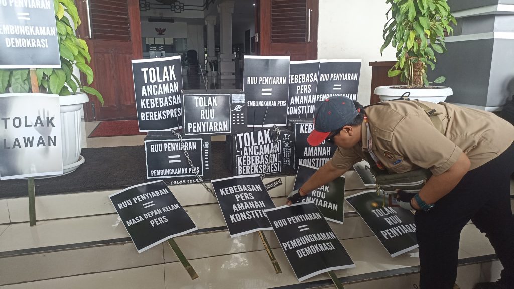 MALANG-KAV.10 Berbagai seragam dari beberapa media memenuhi halaman kantor Dewan Perwakilan Rakyat Daerah Kota Malang Jumat (17/5). Mereka datang untuk menolak draft Rancangan Undang-Undang Nomor 32 Tahun 2002 tentang Penyiaran. Dengan membawa poster-poster, para jurnalis Malang yang tergabung dalam AJI Malang, PWI Malang, IJTI Korda Malang Raya, dan PFI Malang ini menyampaikan protes terhadap RUU Penyiaran yang akan merenggut kebebasan pers.