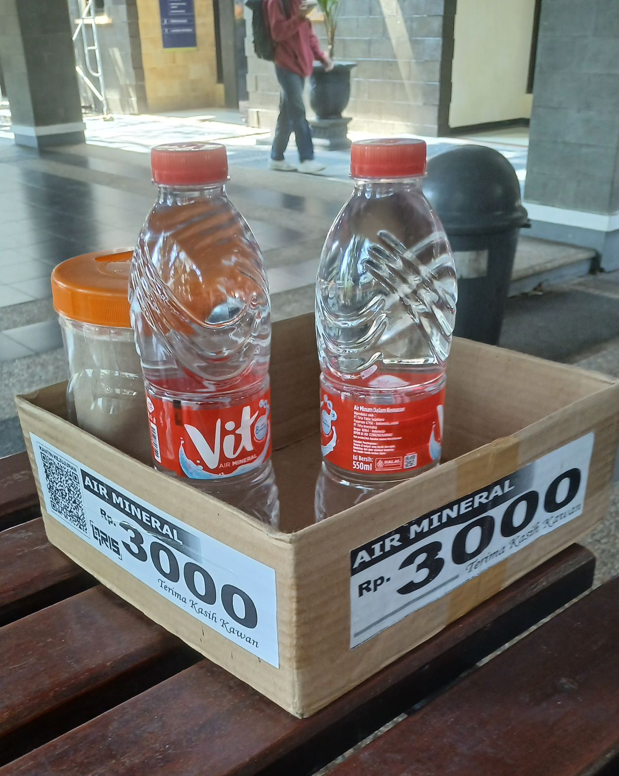 Sugiono bukan sekadar pedagang yang memanfaatkan celah aturan. Ia memperhatikan detail kecil agar dagangannya tidak mengganggu kenyamanan mahasiswa. Wadah yang dipakainya adalah kardus bekas Vit yang dilipat menjadi dua—solusi murah karena membeli nampan plastik berharga Rp6.000 per buah akan menggerus modalnya. Ukuran kardusnya dibuat kecil, cukup untuk menampung beberapa botol tanpa memakan banyak ruang di meja. “Kita harus pandai-pandai kita jaga diri, jaga kondisi supaya enggak begitu mengganggu. Terus enggak kelihatan kumuh atau kotor kan gitu. Harus tetap bersih,” jelasnya tentang prinsip berdagangnya.