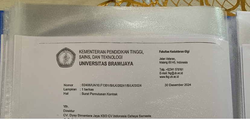 MALANG—KAV.10 Pemutusan kontrak proyek lanjutan pembangunan Gedung Fakultas Kedokteran Gigi (FKG) Universitas Brawijaya (UB) tahap III diwarnai kejanggalan dalam penerbitan surat keputusan. Surat pemutusan kontrak yang diterima kontraktor pada 21 Januari 2025 ternyata bertanggal 30 Desember 2024, jauh sebelum surat tersebut sampai ke tangan penyedia jasa.