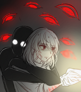 “Kemarilah!” Elaeis berkata, mencondongkan tubuhnya sedikit agar penyintas itu dapat bersembunyi di belakang tubuh kokoh namun gemulai miliknya.