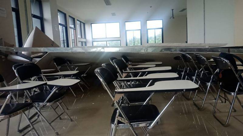 Partisi pembatas antar kelas FP roboh (19/02), Foto: Aegis MALANG-KAV.10 Peristiwa rubuhnya partisi pembatas antar kelas yang terjadi di Gedung...