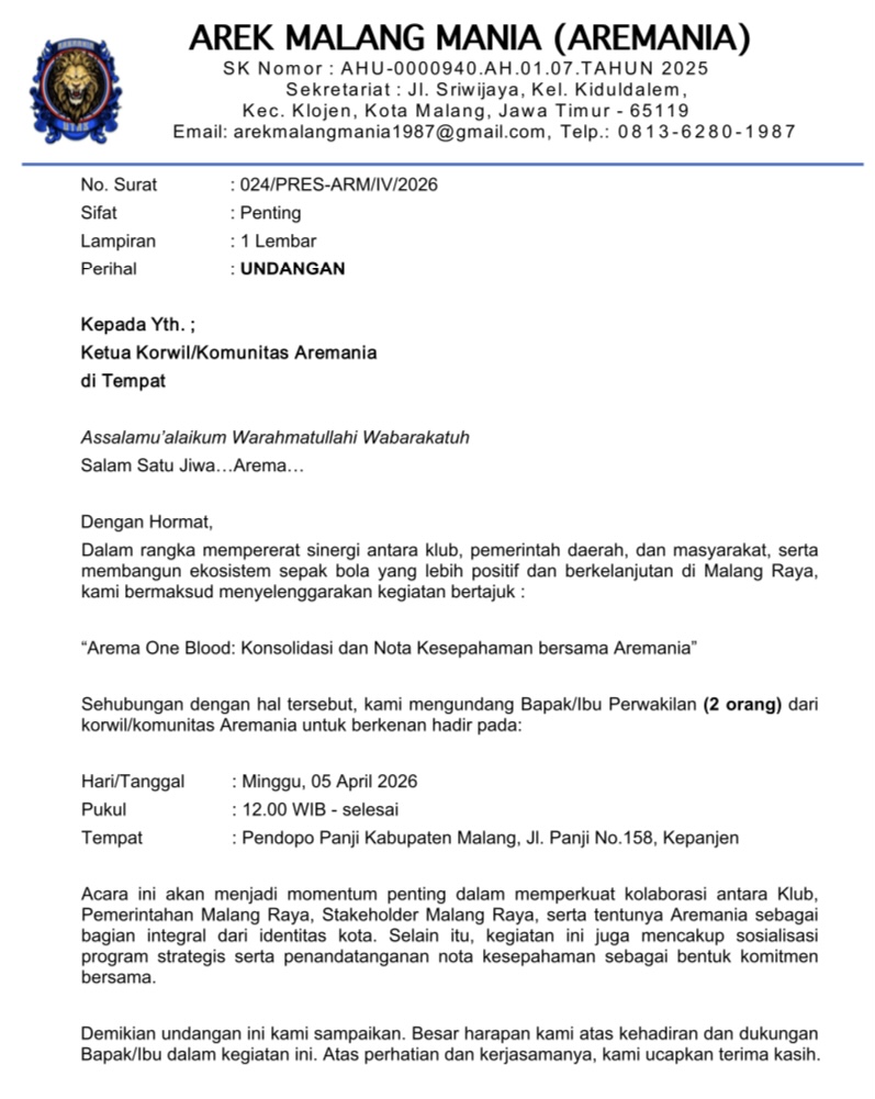 AMARAH BRAWIJAYA TOLAK NOTA KESEPAHAMAN PRESIDIUM AREMANIA SOAL LAGA PERSEBAYA VS AREMA FC DI KANJURUHAN