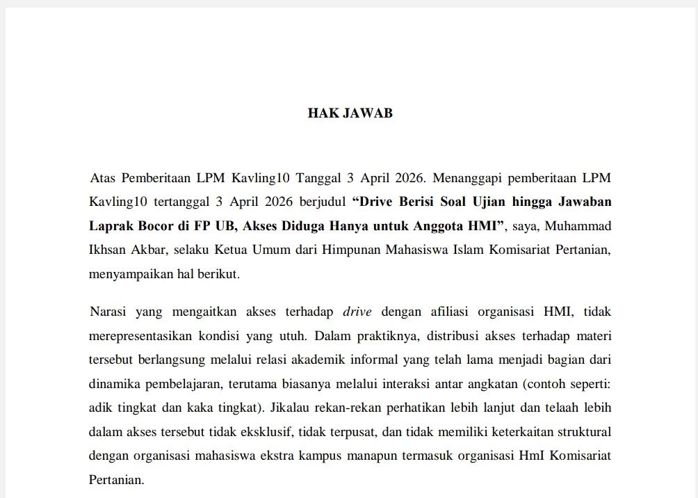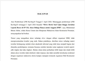 HAK JAWAB HMI KOMISARIAT PERTANIAN TERKAIT BERITA DRIVE BERISI SOAL UJIAN DI FP UB