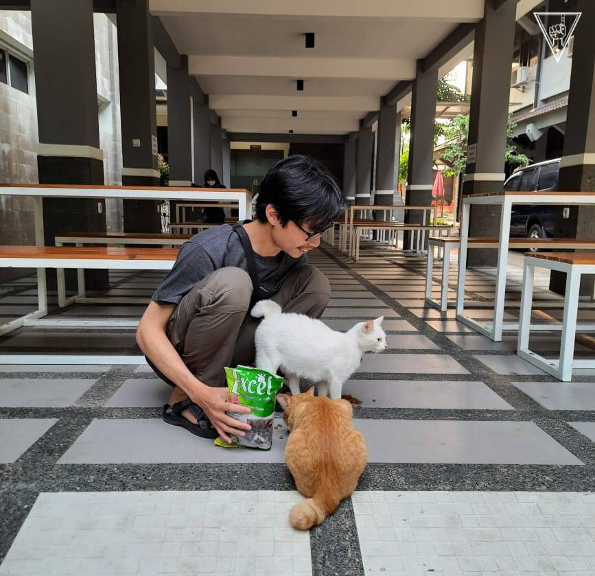 Sambil menjinjing plastik pakan kucing, Rifki menyusuri trotoar di sekitar gedung Biologi FMIPA. Ia hafal betul titik-titik di mana kucing liar biasa ditemukan. Ia juga tahu bagaimana menarik perhatian para kucing.