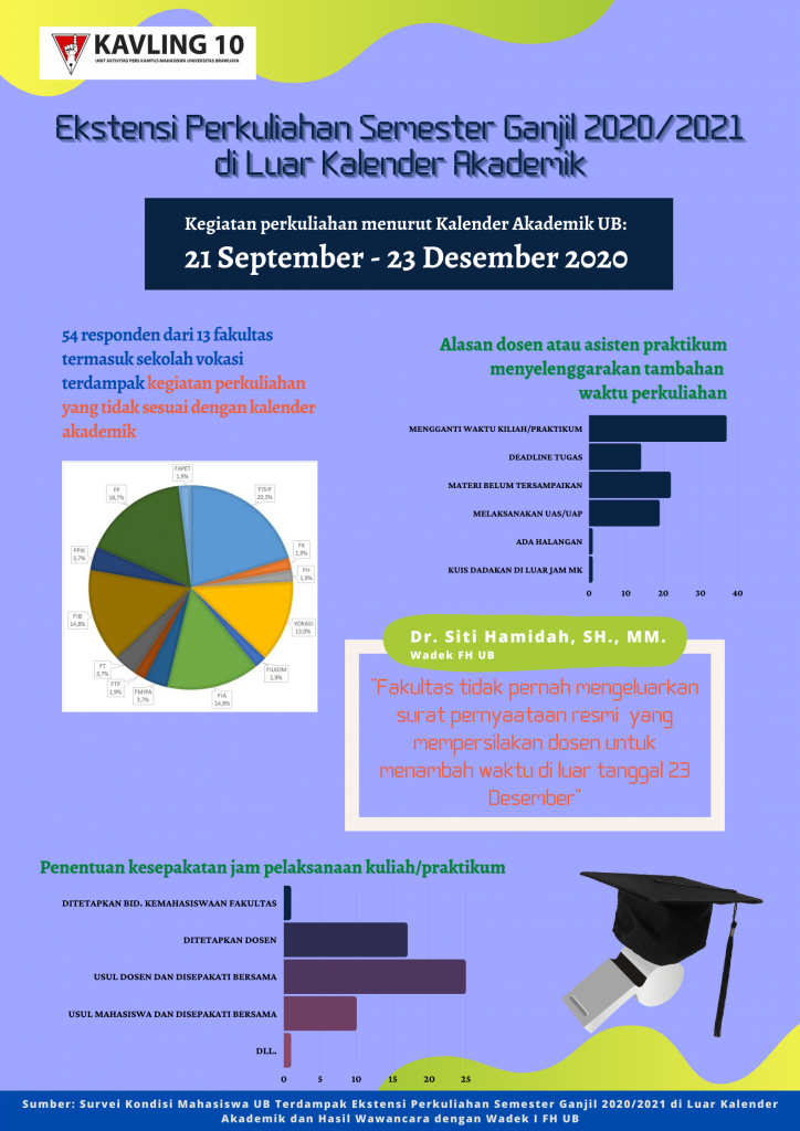 Jadwal Perkuliahan daring semester ganjil di Universitas Brawijaya telah dipublikasi pada awal semester. Mengacu pada kalender akademik, perkuliahan berakhir pada tanggal 23 Desember 2020. Namun hal tersebut tampaknya tidak sepenuhnya bisa direalisasikan oleh dosen, dimana sebagian besar fakultas menambah jadwal lebih dari tenggat waktu yang tercantum pada kalender tersebut. Faktor yang mendorong dari adanya ekstensi waktu perkuliahan sangat beragam, mulai dari kelas pengganti hingga deadline penugasan. Namun Wakil Dekan FH memberikan penegasan bahwasanya pihak fakultas tidak memberikan izin ekstensi di luar jadwal yang ditentukan.