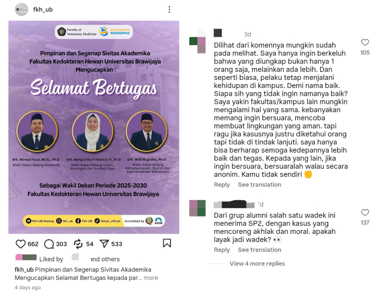 MALANG-KAV.10 Postingan pelantikan Wakil Dekan (WD) Fakultas Kedokteran Hewan (FKH) yang diunggah akun Instagram resmi @fkh_ub pada Senin (8/9) lalu dibanjiri komentar. Widi Nugroho yang dilantik menjadi WD 3 bidang Kemahasiswaan, Alumni, dan Kewirausahaan Mahasiswa menjadi fokus perhatian warganet. Ramai disebut sebagai pelaku pelecehan seksual, Dekan FKH Dyah Ayu Oktavianie menegaskan bahwa dia bersama Tim Verifikasi tidak mengusulkan nama itu kepada Rektor.
