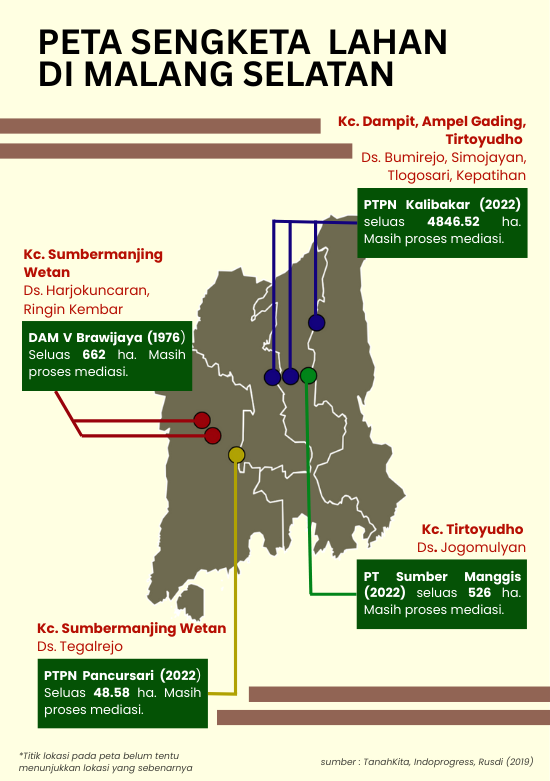Dikutip dari Indoprogress, Konsorsium Pembaruan Agraria (KPA) mencatat 212 konflik agraria yang mencakup 459 desa dengan luas mencapai 1.035.613 hektare sepanjang tahun 2022. Dalam periode 2018 hingga 2022, letusan konflik telah mencapai 2.467 kasus dan dirasakan setidaknya oleh 700 ribu kepala keluarga. Tak terkecuali di Malang. Di antara sederet kasus itu, konflik di Malang Selatan menjadi potret mengenai keterlibatan institusi negara–khususnya militer sebagai aktor perampasan lahan.