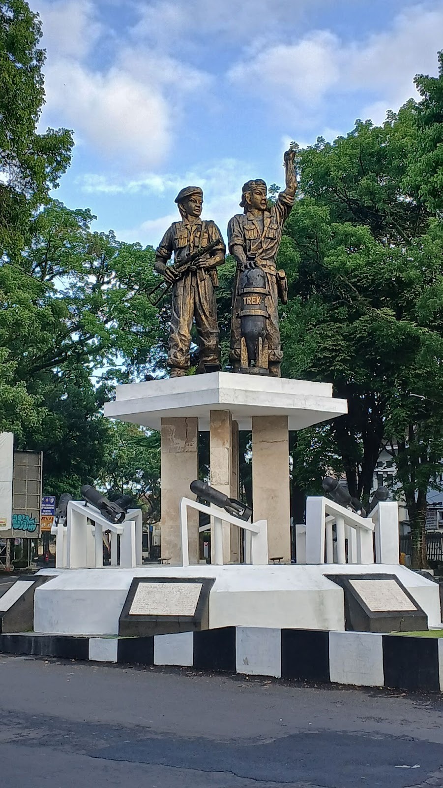 Di belakang Stadion Gajayana Malang, di tengah-tengah Jalan Semeru, tampak dua sosok orang pemuda berseragam berwarna hitam keemasan. Satu membawa bedil sedangkan rekannya memegang sebuah bom dengan tulisan “TREK – BOM”. Mereka terlihat memijak alas kotak berwarna putih yang disangga 4 pilar berbentuk kotak. Di dasar monumen terlihat beberapa bom yang terletak diatas tumpuan dengan “siripnya” miring ke bawah.