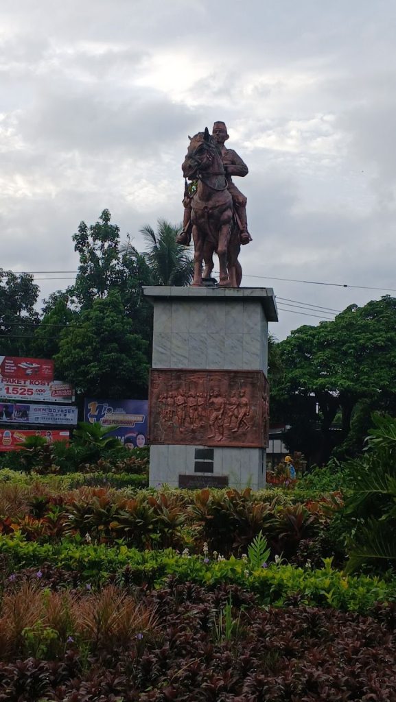 Di bawah gamisnya terlihat celana panjang dan sandal, sedangkan tangan kanannya menggengam tasbih. Lengan tasbih itu bergandengan dengan seseorang berseragam coklat. Kakinya dibungkus sepatu hitam dan tangan satunya menggenggam buku bersampul biru. Di bawah kaki mereka ada tulisan “MONUMEN KEMANUNGGALAN ABRI DAN RAKYAT”.